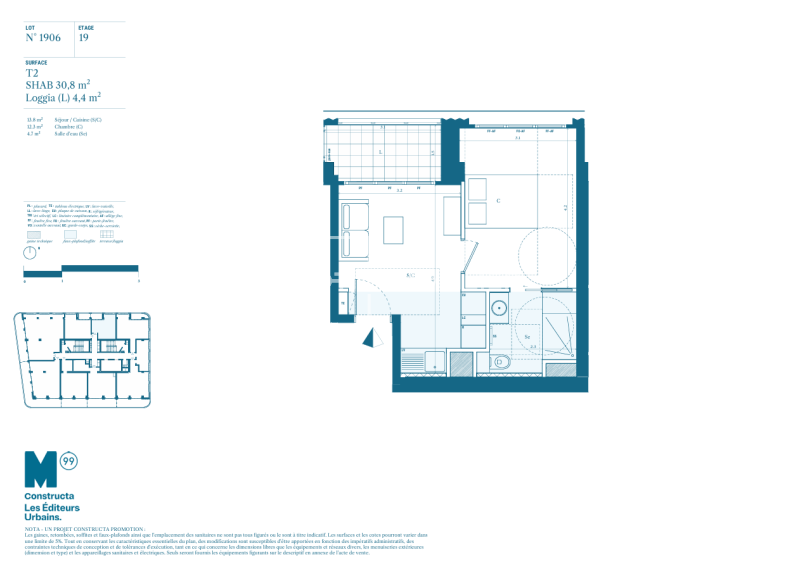 M99, la première tour d'habitation en France depuis plus de 50 ans, s'élève à 99 mètres et redéfinit le paysage marseillais. Du 14e au 29e étage, ses appartements sont tous prolongés de terrasses avec vues spectaculaires sur la Méditerranée, Notre-Dame de la Garde ou la ville. Au 30e étage, un toit terrasse de 300m², réservé exclusivement aux habitants de M99, se transforme en un jardin en plein ciel avec une vue unique. Après les deux tours CMA CGM, la tour La Marseillaise, La Porte Bleue, M99 vient conclure la skyline phocéenne.