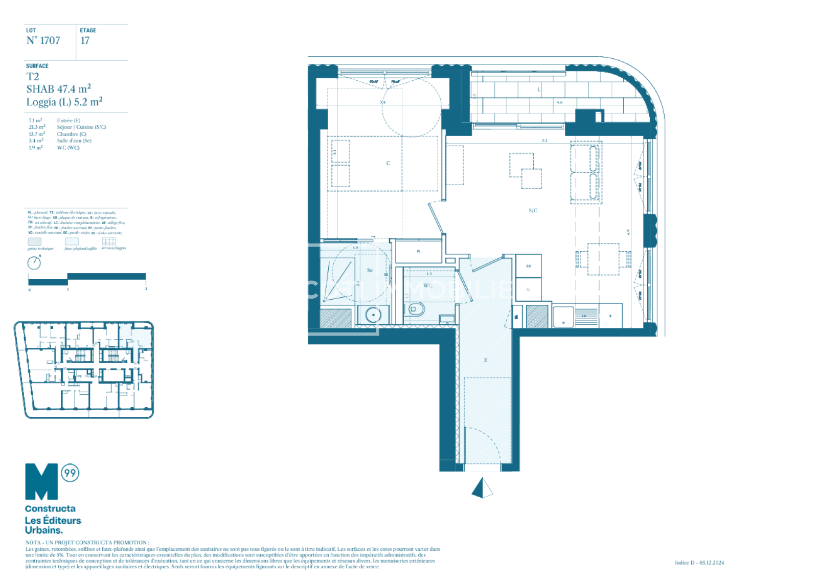 2 PIECES 17EME ETAGE AVEC LOGGIA - 47.4m²
