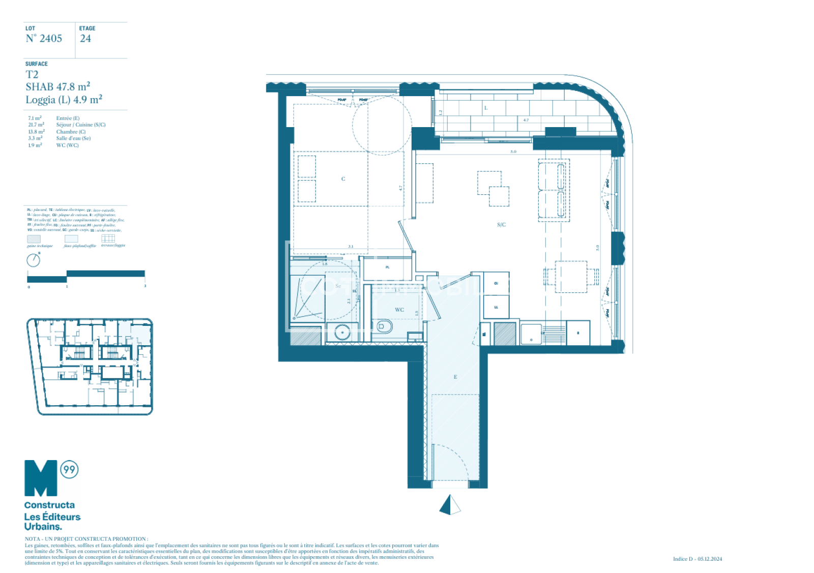 2 PIECES 24EME ETAGE AVEC LOGGIA - 47.8m²