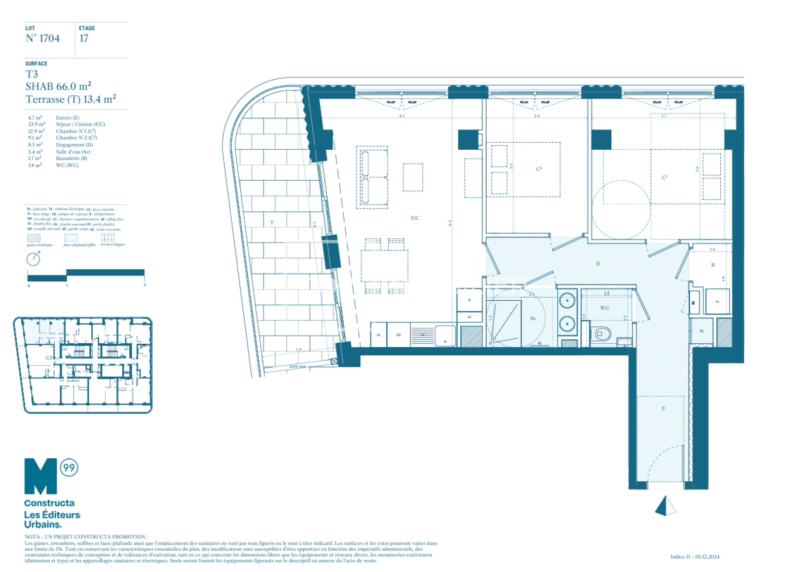 3 PIECES 17EME ETAGE AVEC TERRASSE - 66m²