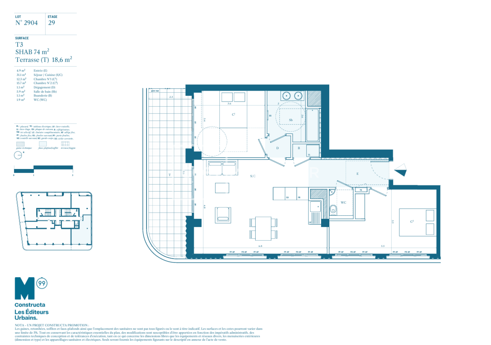 M99, la première tour d'habitation en France depuis plus de 50 ans, s'élève à 99 mètres et redéfinit le paysage marseillais. Du 14e au 29e étage, ses appartements sont tous prolongés de terrasses avec vues spectaculaires sur la Méditerranée, Notre-Dame de la Garde ou la ville. Au 30e étage, un toit terrasse de 300m², réservé exclusivement aux habitants de M99, se transforme en un jardin en plein ciel avec une vue unique. Après les deux tours CMA CGM, la tour La Marseillaise, La Porte Bleue, M99 vient conclure la skyline phocéenne.