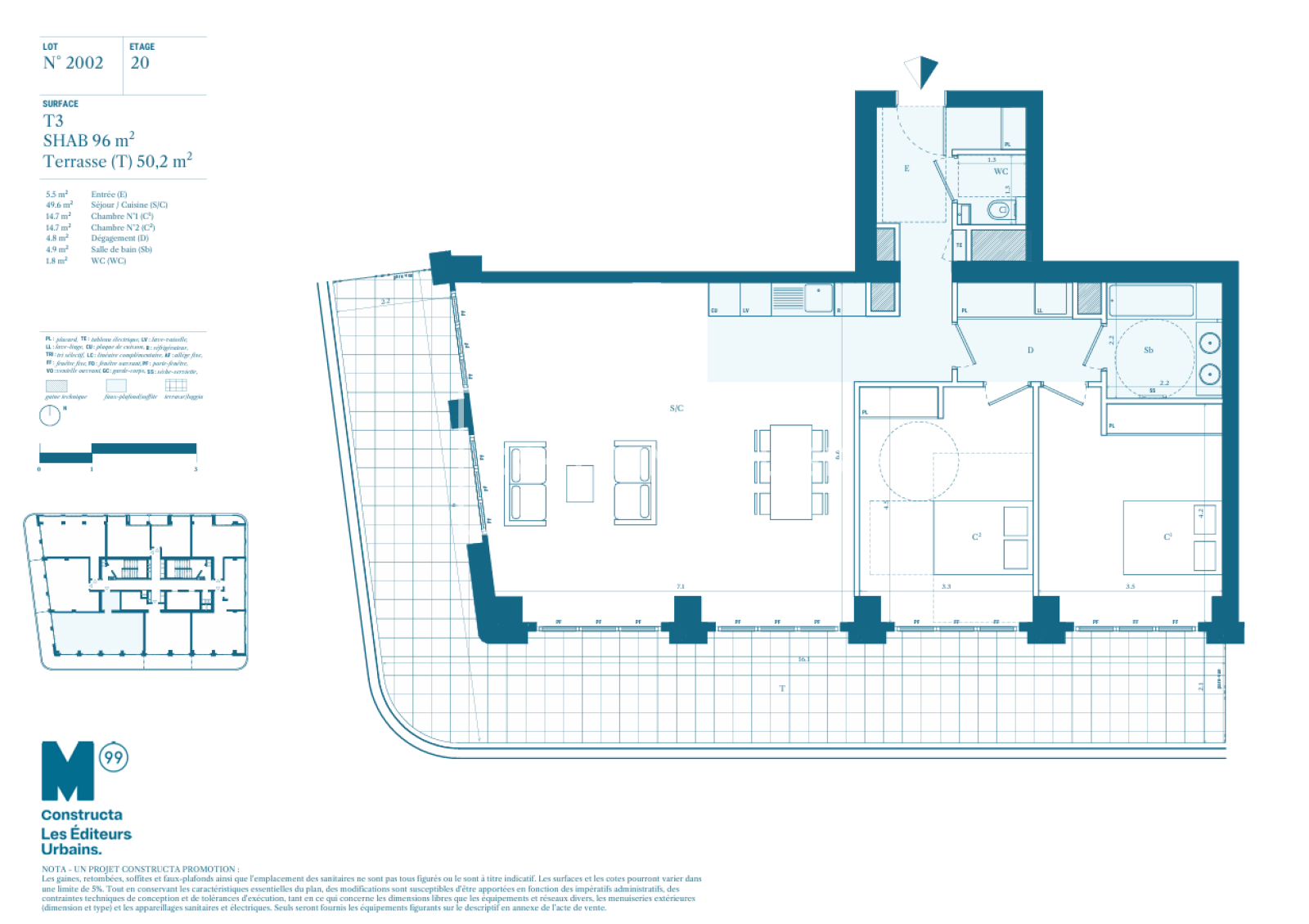 M99, la première tour d'habitation en France depuis plus de 50 ans, s'élève à 99 mètres et redéfinit le paysage marseillais. Du 14e au 29e étage, ses appartements sont tous prolongés de terrasses avec vues spectaculaires sur la Méditerranée, Notre-Dame de la Garde ou la ville. Au 30e étage, un toit terrasse de 300m², réservé exclusivement aux habitants de M99, se transforme en un jardin en plein ciel avec une vue unique. Après les deux tours CMA CGM, la tour La Marseillaise, La Porte Bleue, M99 vient conclure la skyline phocéenne.