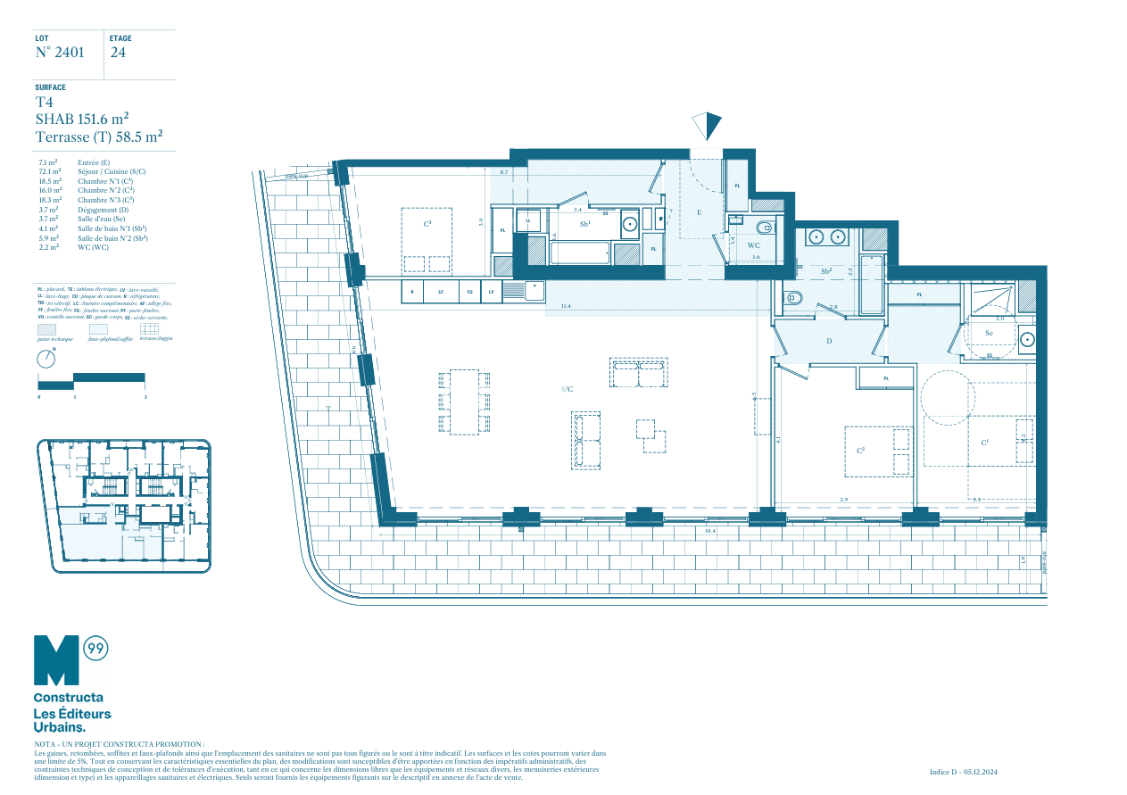 M99, la première tour d'habitation en France depuis plus de 50 ans, s'élève à 99 mètres et redéfinit le paysage marseillais. Du 14e au 29e étage, ses appartements sont tous prolongés de terrasses avec vues spectaculaires sur la Méditerranée, Notre-Dame de la Garde ou la ville. Au 30e étage, un toit terrasse de 300m², réservé exclusivement aux habitants de M99, se transforme en un jardin en plein ciel avec une vue unique. Après les deux tours CMA CGM, la tour La Marseillaise, La Porte Bleue, M99 vient conclure la skyline phocéenne.