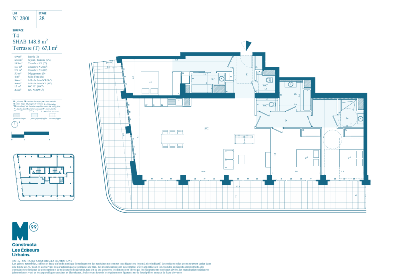 M99, la première tour d'habitation en France depuis plus de 50 ans, s'élève à 99 mètres et redéfinit le paysage marseillais. Du 14e au 29e étage, ses appartements sont tous prolongés de terrasses avec vues spectaculaires sur la Méditerranée, Notre-Dame de la Garde ou la ville. Au 30e étage, un toit terrasse de 300m², réservé exclusivement aux habitants de M99, se transforme en un jardin en plein ciel avec une vue unique. Après les deux tours CMA CGM, la tour La Marseillaise, La Porte Bleue, M99 vient conclure la skyline phocéenne.